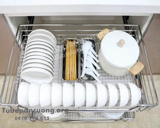 - Sản phẩm có ray trượt bắt trực tiếp vào thành tủ nên đảm bảo chắc chắn, chịu trọng tải lớn và không dễ bị võng giữa hay cong vênh trong quá trình sử dụng. Đặc biệt, kích thước giá để bát đĩa trong tủ có thể dịch chuyển từ 3-5 phân nên rất tiện lợi.