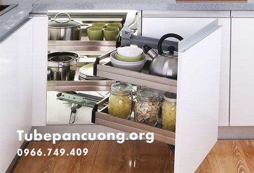 - Chỉ cần mở cánh góc tủ bếp dưới, kệ góc liên hoàn sẽ tự động kéo ra và khách hàng lấy đồ nhanh chóng, tiện lợi.